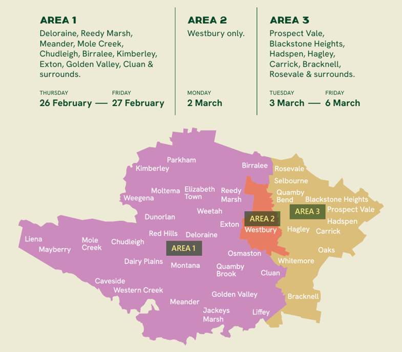 - Tuesday 3 to Friday 6 March – Hagley, Carrick, Hadspen, Prospect Vale, Blackstone Heights, Bracknell, Rosevale and surrounds