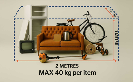 - Individual items must not weigh more than 40 kg and must be able to be safely lifted by two people.
